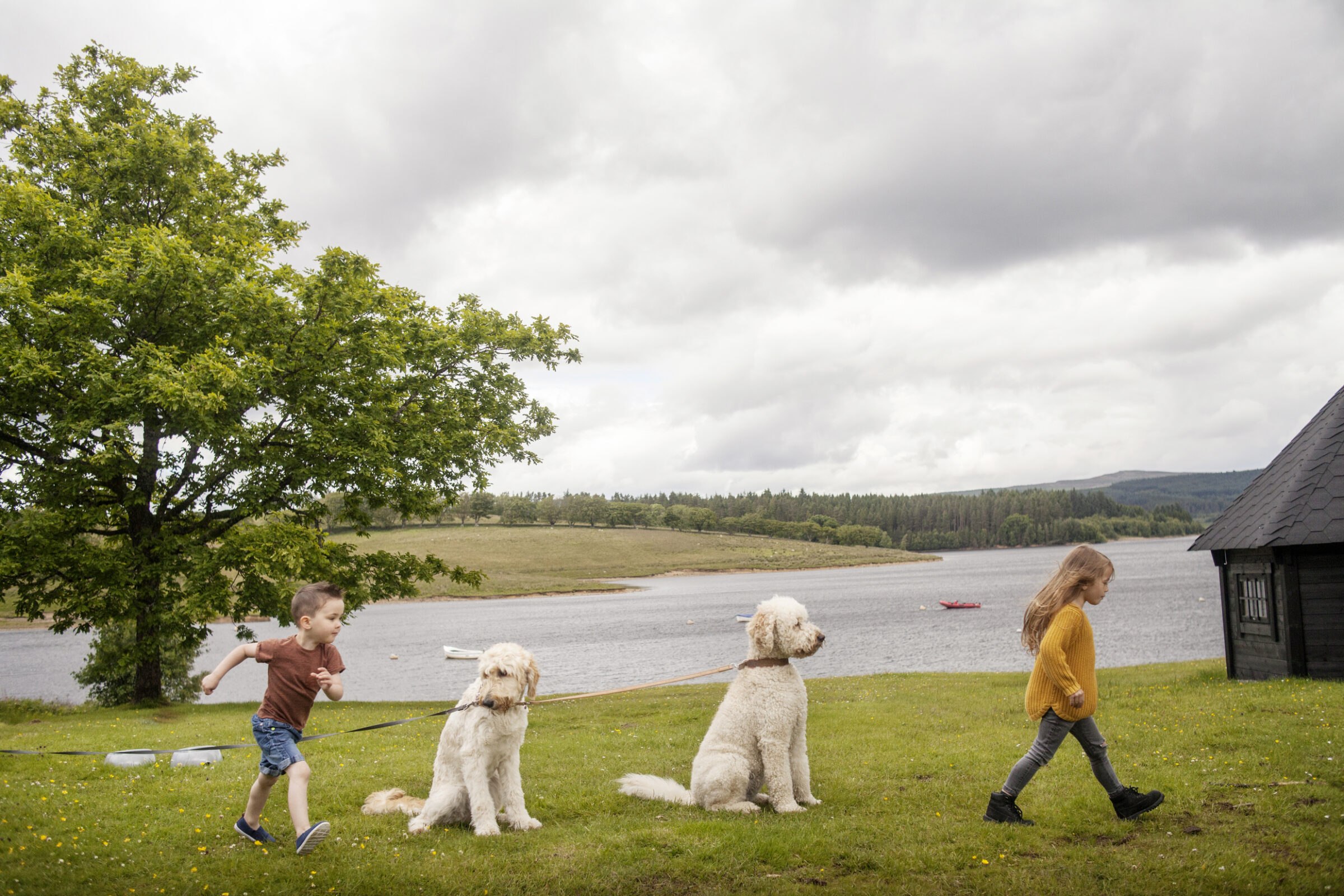 Children and their dogs take a walk at Kielder